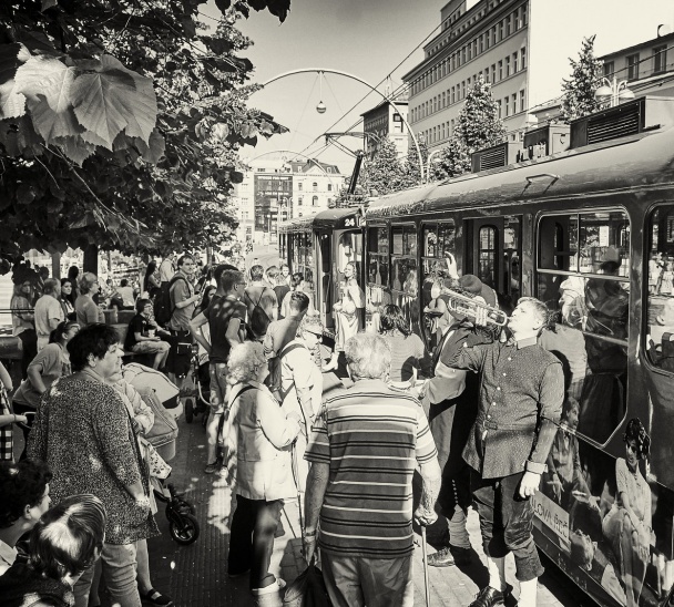 1. září v dopoledních hodinách projížděla Libercem - právě tak, jako vloni - divadelní tramvaj. Činoherci a členové orchestru lákali nejen slovem a hudbou, ale i divadelními propagačními materiály na novou divadelní sezónu. Baletní soubor zatančil přímo před obchodním centrem Fórum.