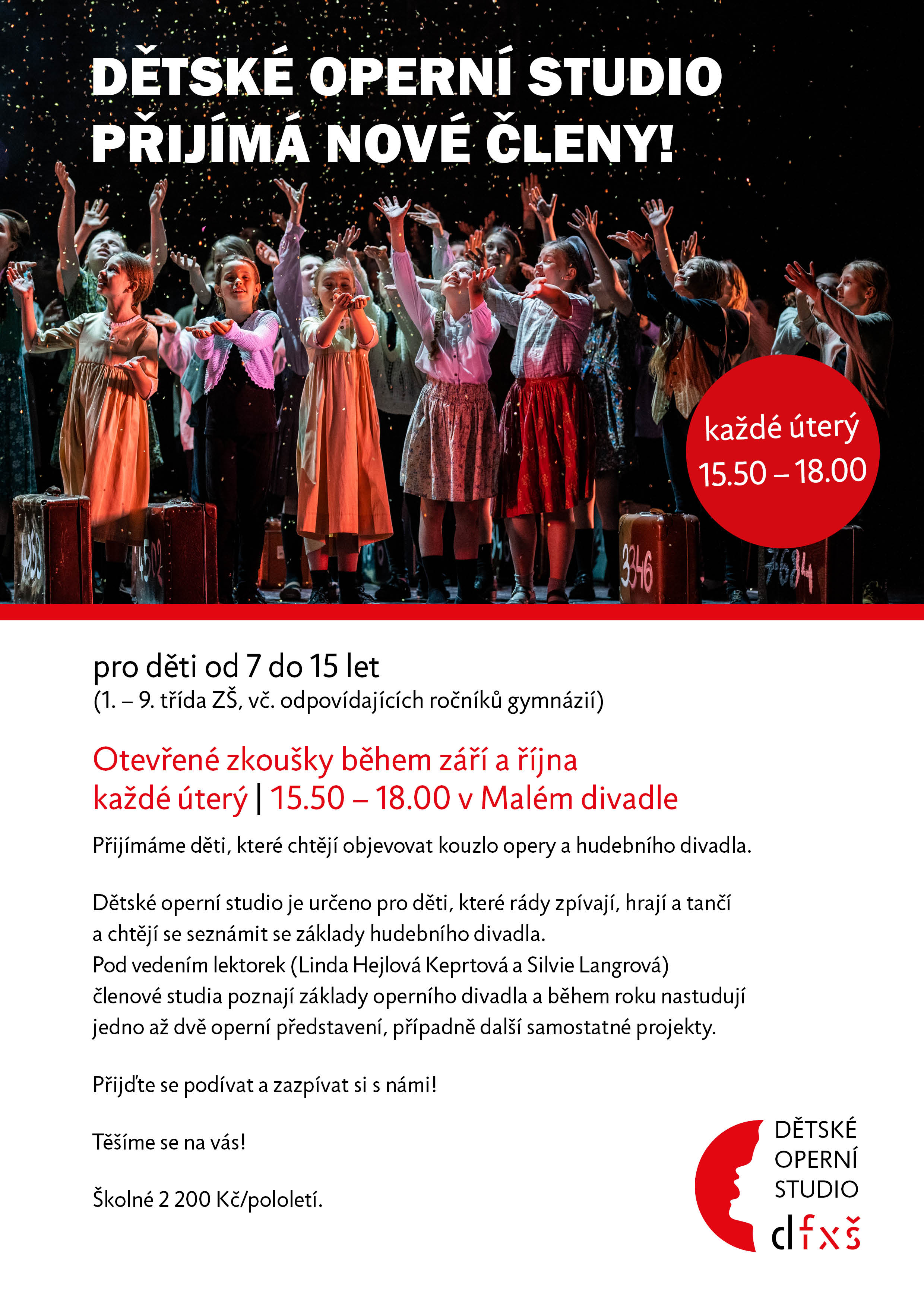 Dětské operní studio je určeno pro děti, které rády zpívají, hrají a tančí a chtějí se seznámit se základy hudebního divadla.