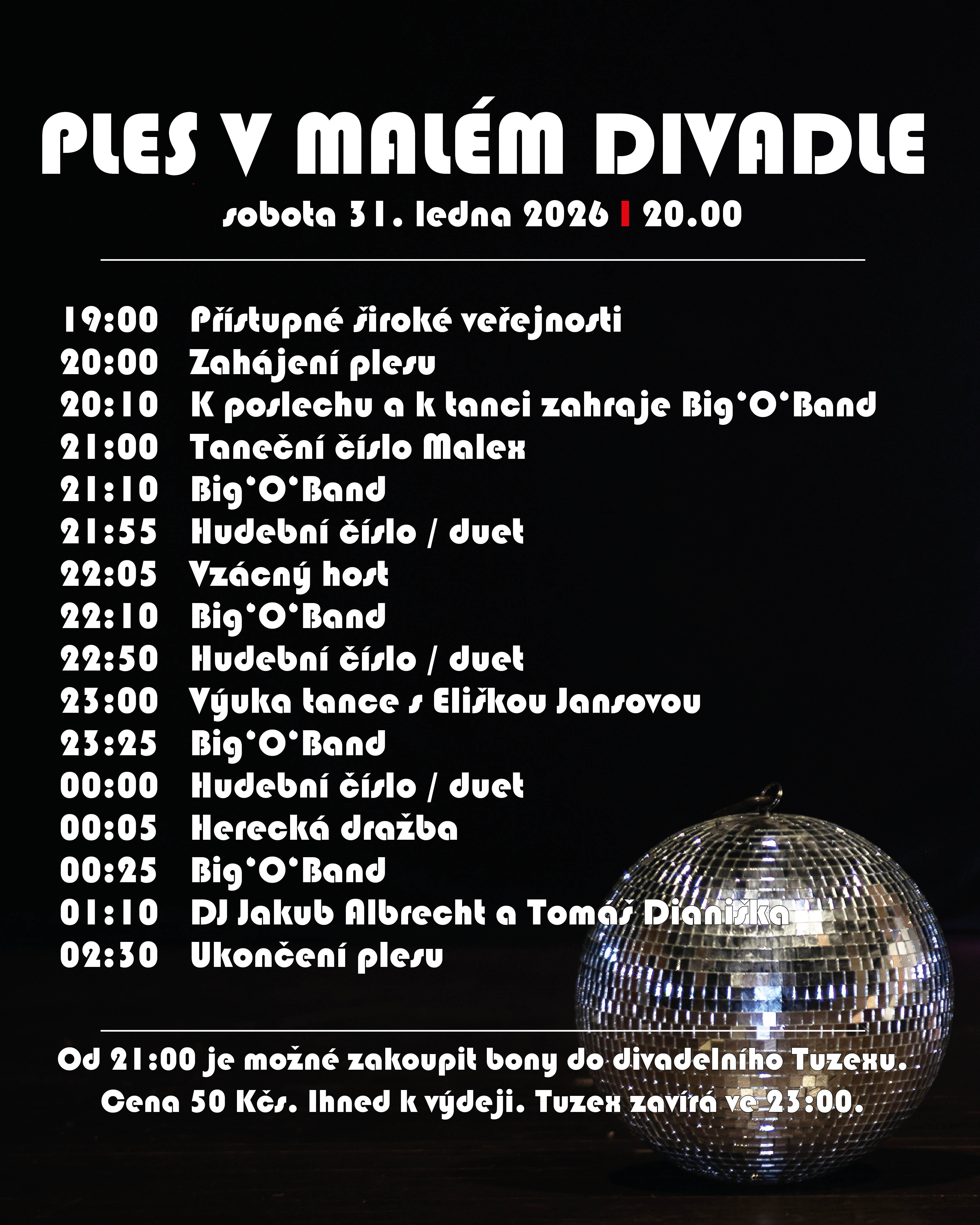 Otevření sálu v 19.00 h. Zahájení plesu ve 20.00 h.